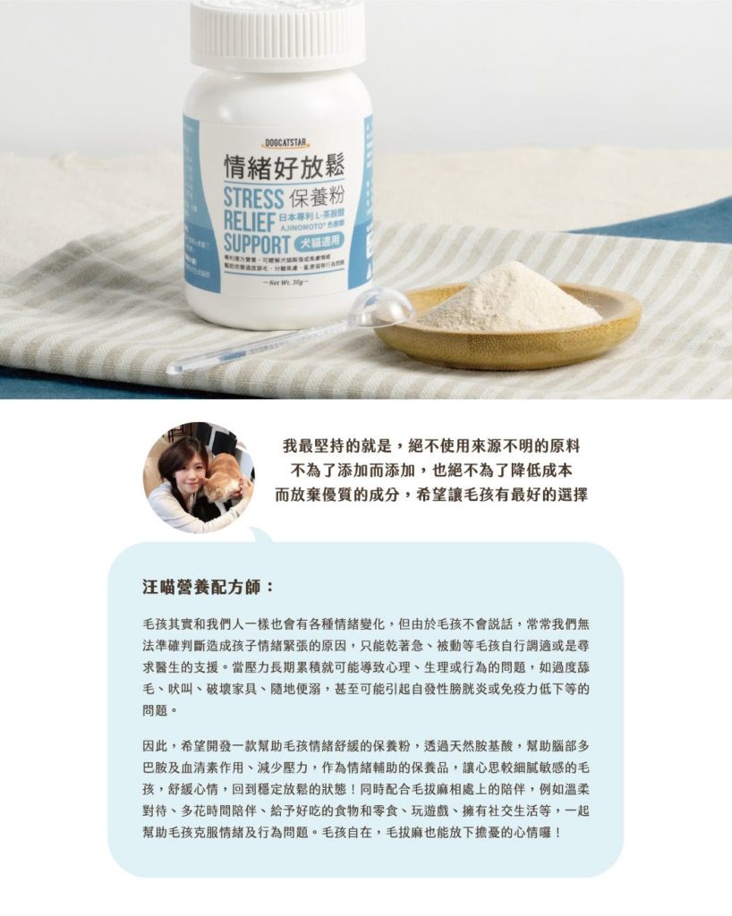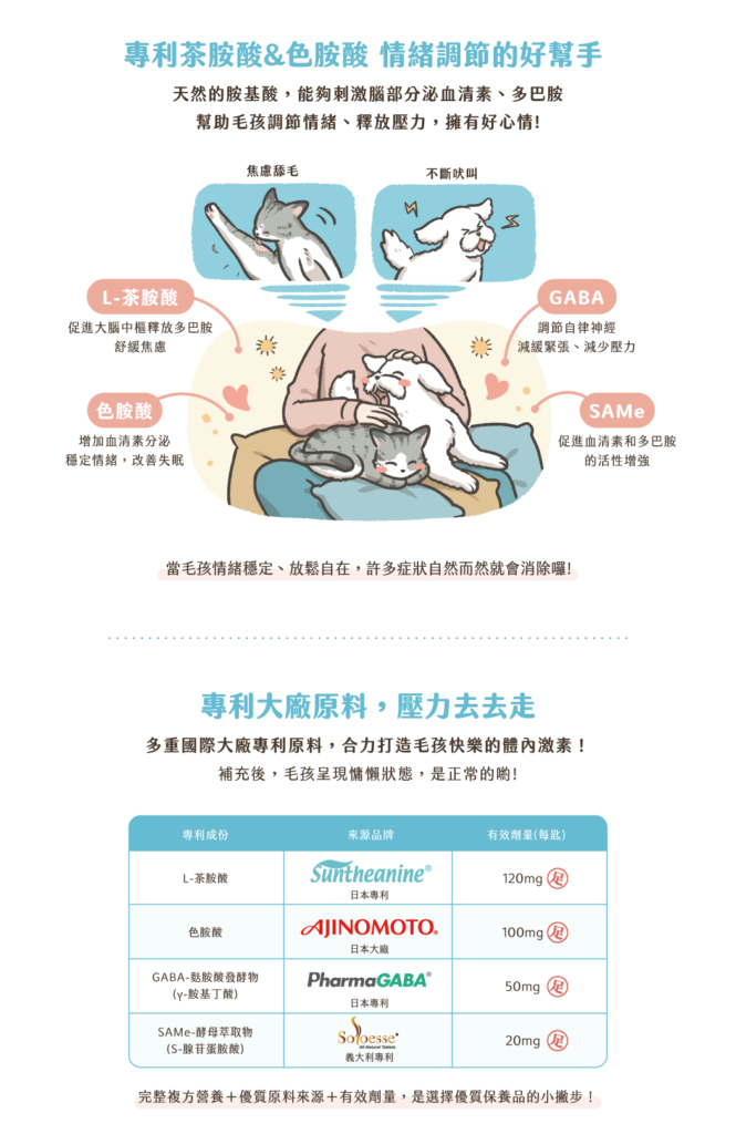 ?嚴選國際專利成分與複方設計,透過天然胺基酸,幫助毛孩減少壓力!