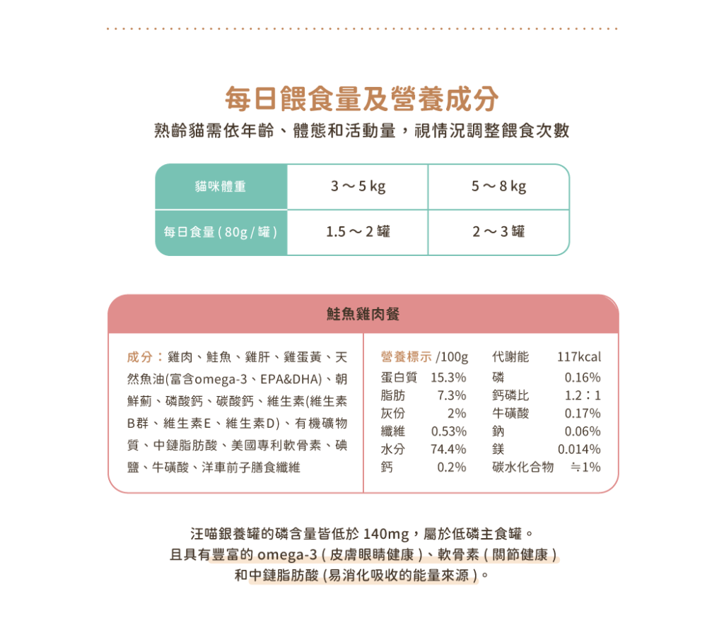 ?專屬營養設計,關節、腦部及心血管營養補充 ?慕斯質地+水解蛋白技術,好舔食與消化吸收 ?98% 含肉量;完全無人工膠類 ?銀養罐平均磷含量約 130~140 mg/100 kcal