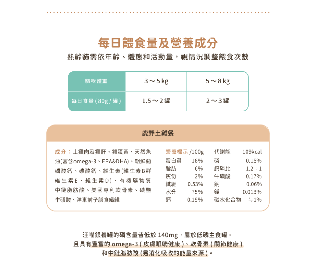 ?低磷主食罐 – 符合NRC/AAFCO 營養標準 磷含量約 138 mg/100 kcal, 比一般成幼貓款低30%