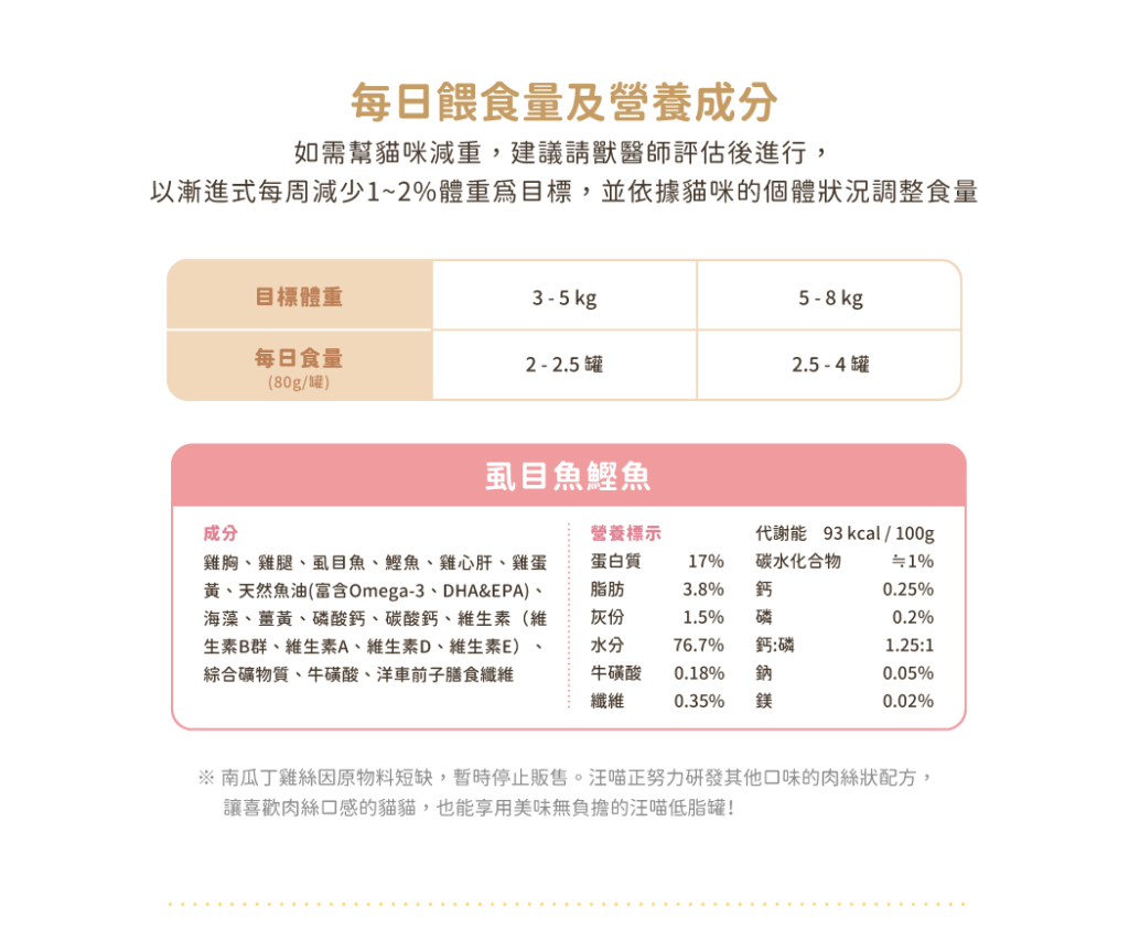 ?符合主食營養 – 符合NRC / AAFCO營養標準﹐控制體重不怕缺乏營養