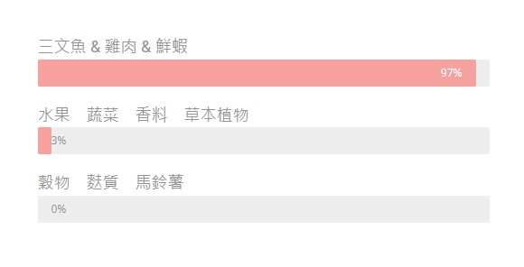 97%三文魚,雞肉和蝦 (新鮮去骨三文魚30%、雞肉30%、雞肉湯30%、去殼海蝦7%)礦物質,甜薯,胡蘿蔔,豌豆,蘋果,苜蓿,鷹嘴豆,番茄,木薯,梨,紅莓, 藍莓,桑葚,橙,山桑子,越橘,葡萄糖胺,軟骨素,番芫茜,薄荷,螺旋藻,海藻,牛至,鼠尾草,馬鬱蘭,百里香,洋甘菊,玫瑰果,絲蘭,菊苣,茴香,蕁麻,馬鬱蘭,胡蘆巴,肉桂,MSM