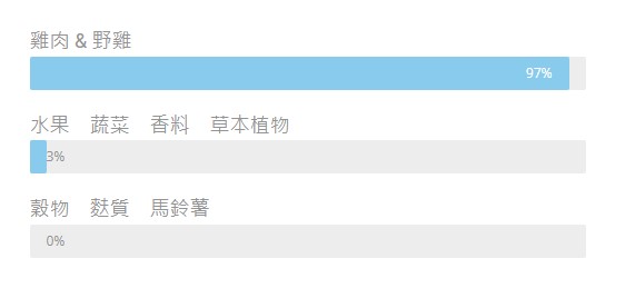 97%雞和野雞 (新鮮去骨雞肉60%,雞肉湯30%,新鮮去骨野雞肉7%)礦物質,甜薯,胡蘿蔔,豌豆,蘋果,苜蓿,鷹嘴豆,番茄,木薯,梨,紅莓, 藍莓,桑葚,橙,山桑子,越橘,葡萄糖胺,軟骨素,番芫茜,薄荷,螺旋藻,海藻,牛至,鼠尾草,馬鬱蘭,百里香,洋甘菊,玫瑰果,絲蘭,菊苣,茴香,蕁麻,馬鬱蘭,胡蘆巴,肉桂,MSM