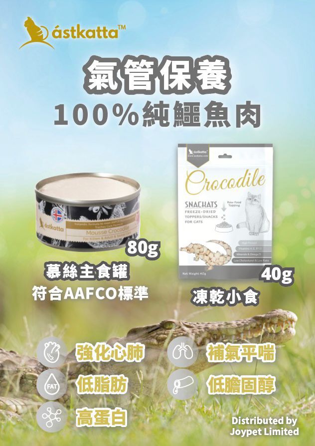 鱷魚肉 30%、大豆油 1.875%、維生素和礦物質 1.368%、改性木薯澱粉 0.269%、牛磺酸 0.062%、硫酸葡萄糖胺 0.057%、吞拿魚油 0.057%、益生元 0.057%、營養湯 66.255%