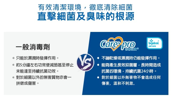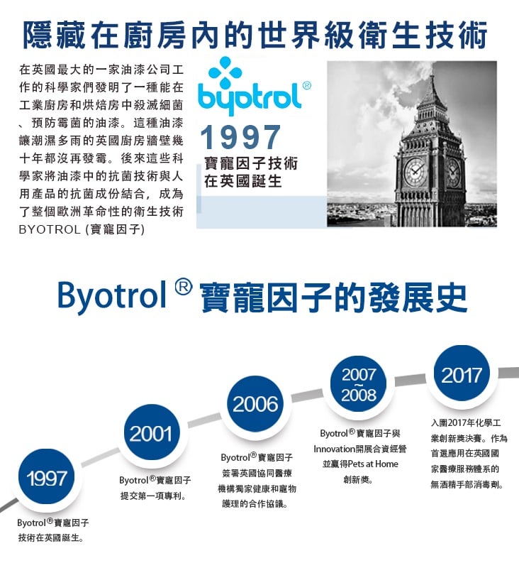Byotrol寶寵因子是基於陽離子生物殺滅劑及疏水聚合物。它的獨特技術優勢主要在於膠懸體內生物殺滅劑。細菌的細胞壁和細胞膜由磷脂質雙分子膜組成,呈負電性的特質,根據物理學異性電荷相吸的原理,只要加入陽離子殺菌劑,帶負電荷的細胞壁就會被陽離子的正電荷所吸引,從而束縛細菌的活動自由度,抑制其呼吸機能,並促使細胞壁和細胞膜徹底變形破裂。