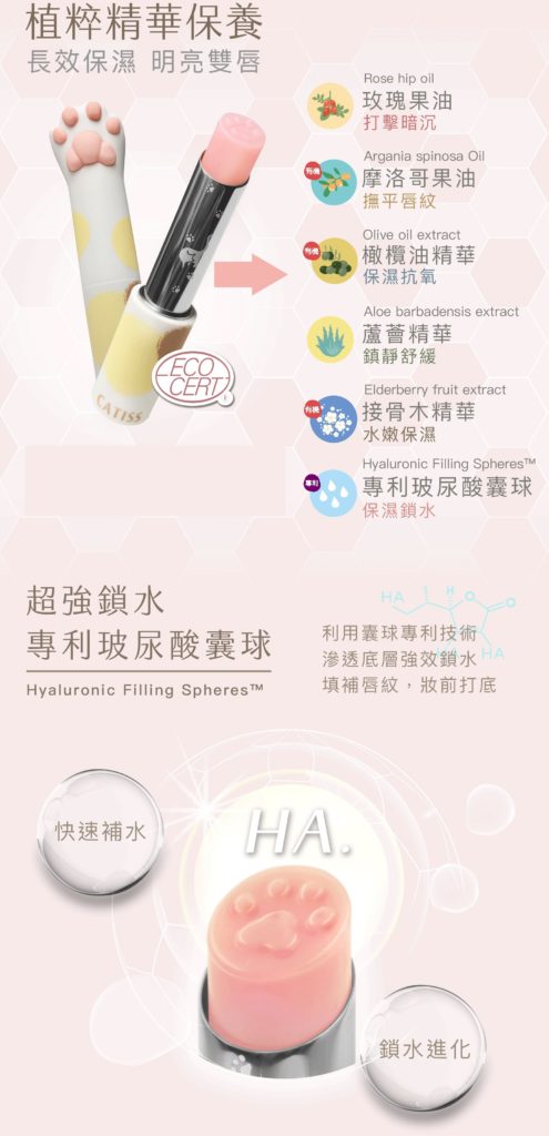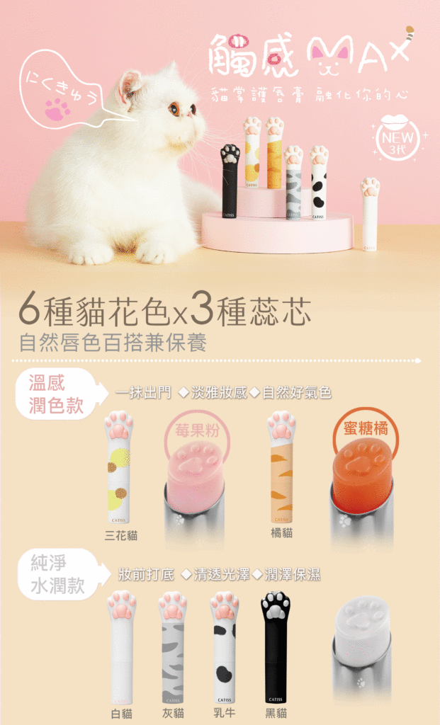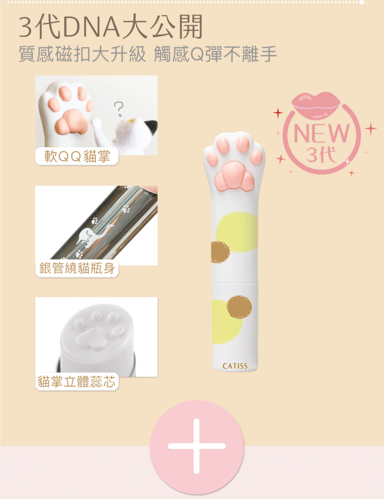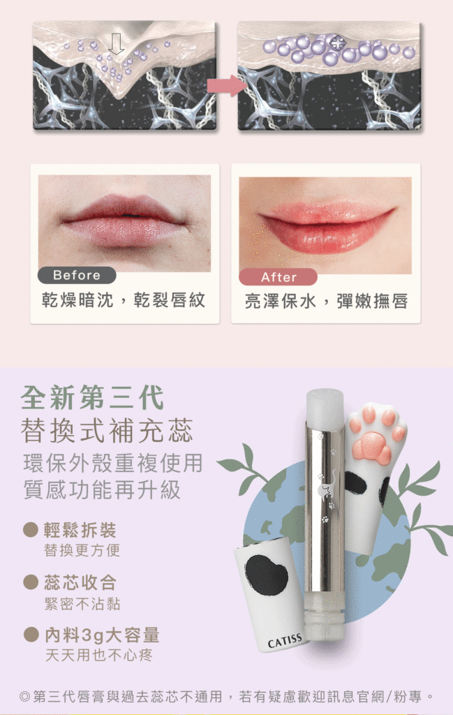 ?三代貓掌護唇膏及蕊芯全面升級? ?補充蕊芯旋轉卡榫設計,收回不沾黏 ?補充蕊3g大用量,高CP值+超環保 ?專利玻尿酸囊球,導入保濕因子深層修護