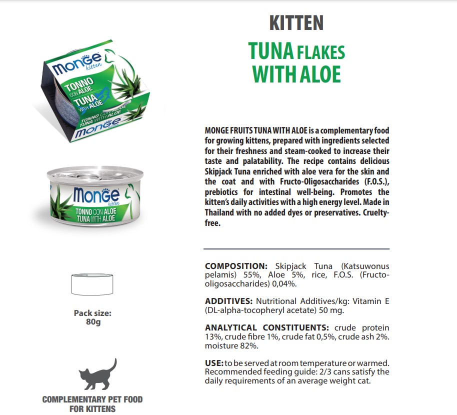 ?精選野生捕獲的大西洋吞拿魚為主要成份,幫助心臟健康及滋養皮膚與毛髮 ?蘆薈含維他命B3, B6促進消化系統健康,強化胃功能,特有的銘元素還是治療或預防糖尿病的最理想選擇 ?豐富的果汁,以美味的方式吸引貓咪補充水份