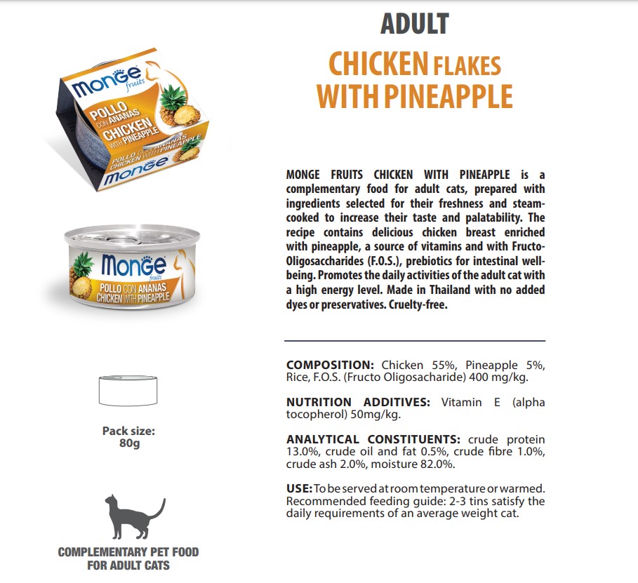 ?精選新鮮走地雞肉,含多種必要的氨基酸、維他命A、維他命B集等營養素,有利於骨骼成長 ?添加含纖維、蛋白酶及消化酶的菠蘿,有助於抗炎症及控制毛球形成,同時有效增加適口性 ?豐富的果汁,以美味的方式吸引貓咪補充水份