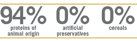 粗蛋白質 30%、粗脂肪 16%、粗纖維 2.3%、水分 8%、粗灰分 6.8%、鈣 1%、磷 0.8%、鎂 0.08%、Omega-6 2%、Omega-3 1.2%、DHA 0.6%、EPA 0.3%、葡萄糖胺 1200mg/kg、硫酸軟骨素 900mg/kg