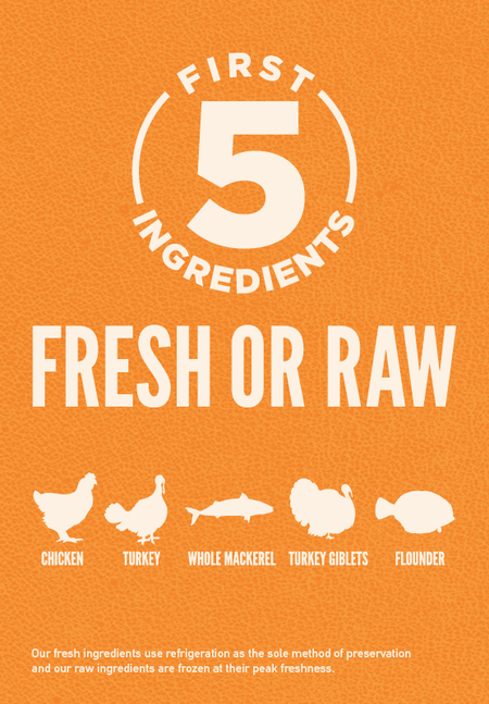 新鮮雞肉(20%)、火雞(10%)、整條鯡魚(9%)、新鮮雞內臟(肝、心)(6%)、整條鱈魚(5%)、火雞肝(5%)、新鮮雞蛋(5%)、脫水雞肉(4%)、脫水火雞(4%)、脫水鯖魚(4%)、脫水沙丁魚(4%)、脫水鯡魚(4%)、雞肉脂肪(4%)、整顆紅扁豆、整顆豌豆、整顆綠扁豆、整顆鷹嘴豆、扁豆纖維、整顆斑豆、豌豆澱粉、整顆海軍豆、鱈魚油(1%)、乾海帶、南瓜、冬南瓜、義大利靑瓜、胡蘿蔔、蘋果、梨、乾菊苣根、羽衣甘藍、菠菜、甜菜葉、蘿蔔菜、蔓越莓、藍莓、薩斯卡通漿果、薑黃、奶薊草、牛蒡根、薰衣草、藥蜀葵根、玫瑰果。