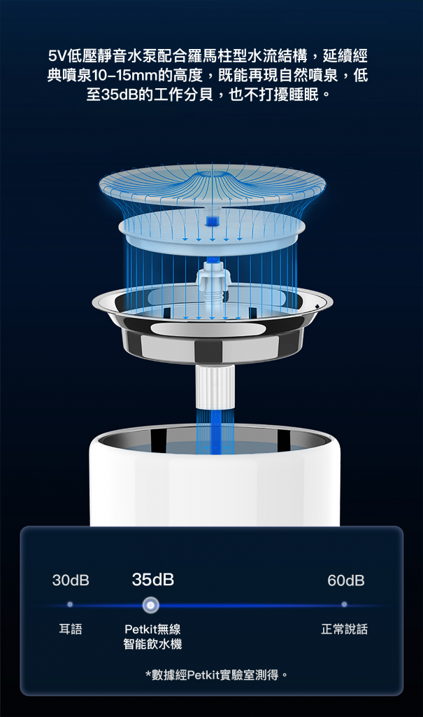 犬貓皆適用 水流接觸面採用 304 不鏽鋼 無線水泵及儲水桶分離式設計, 水電徹底分離, 方便日常清洗 手機APP連接藍芽可監察水機水量及濾芯狀態 三種工作模式: 智能 / 正常 / 夜間 模式 三重過濾: 微孔濾棉 / 活性碳 / 離子交換樹脂 儲水內桶採用高品質食品級304不鏽鋼 高效能靜音水泵, 通過操作測試, 工作噪音約35分貝 1.8L食品級不鏽鋼儲水桶, 適用於貓及小型犬