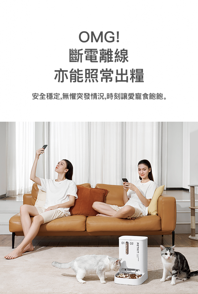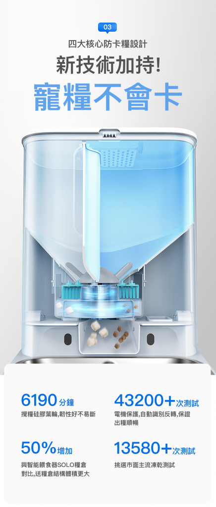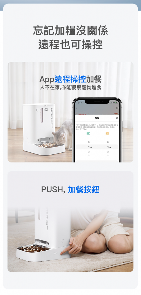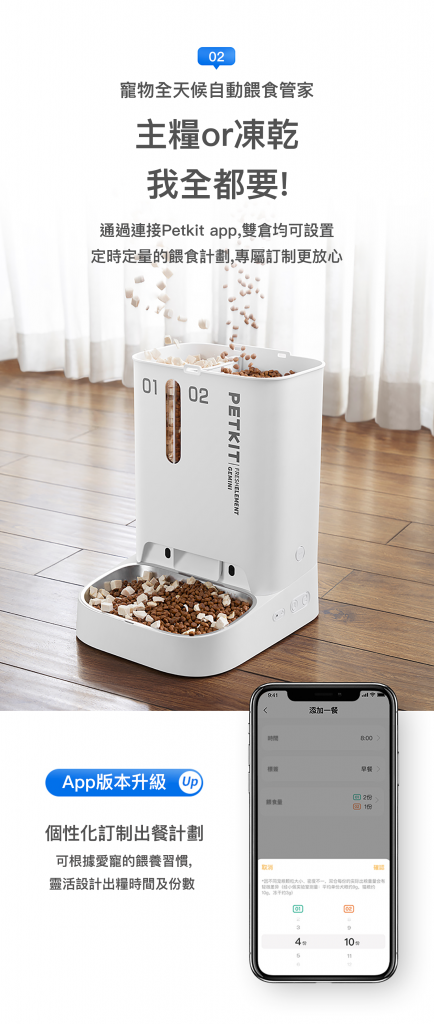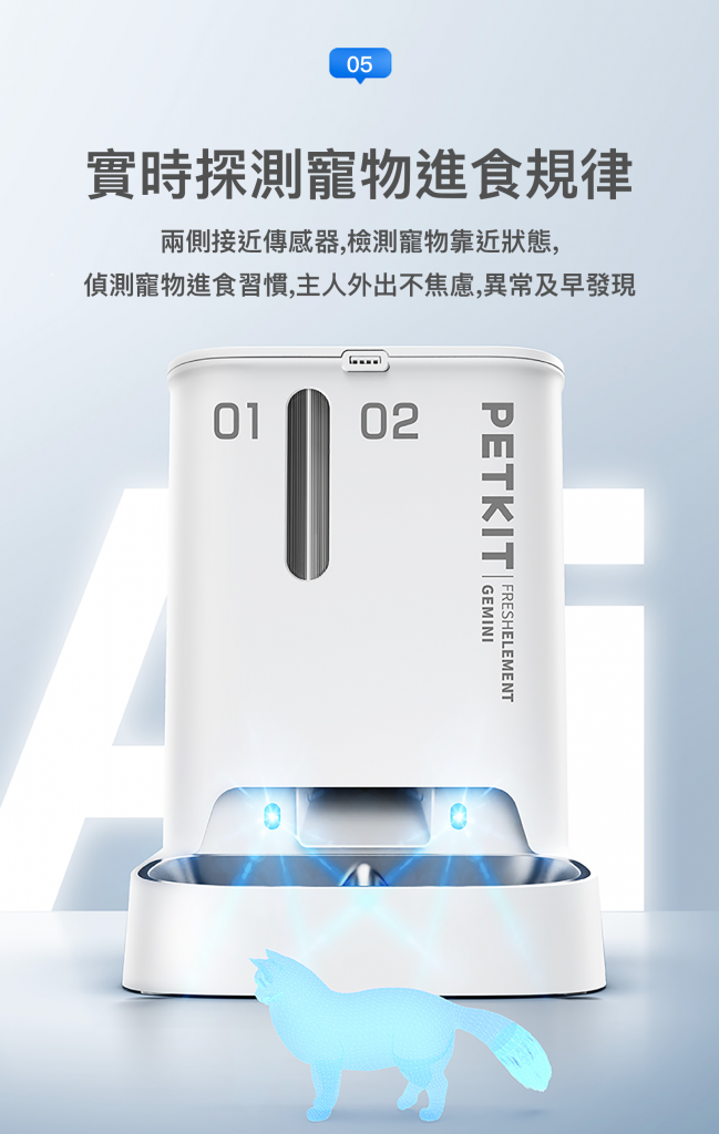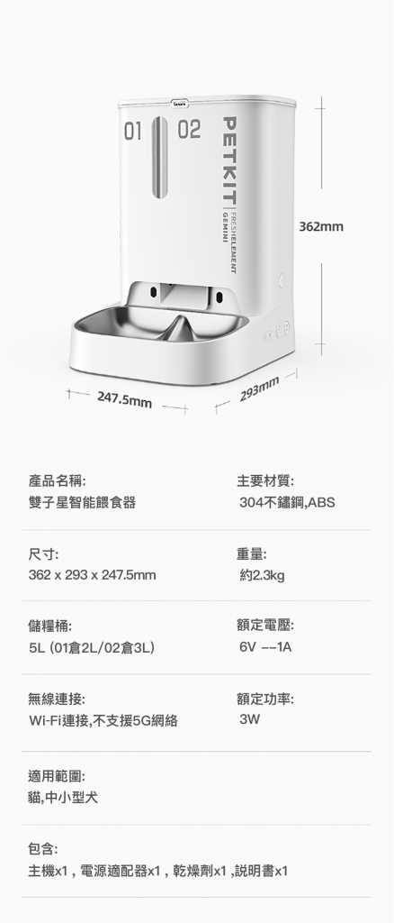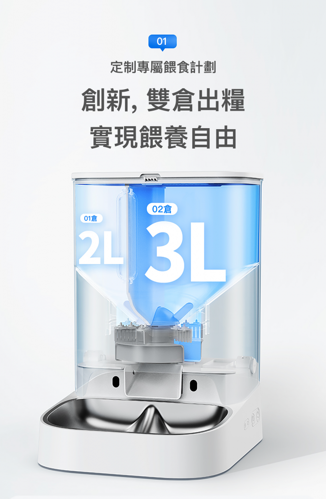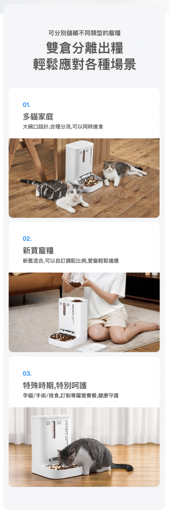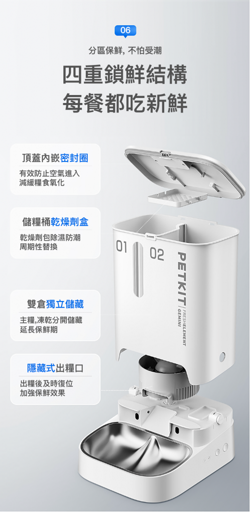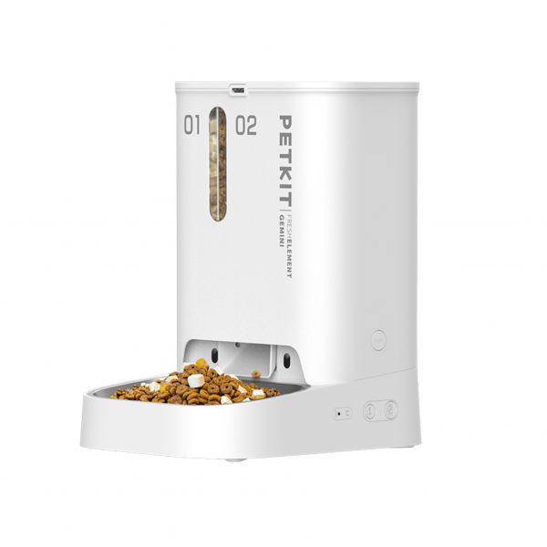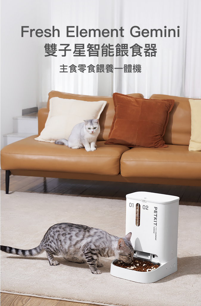 ?Petkit Fresh Element Gemini 智能餵⻝器,雙筒一機獨立設計,主糧零食一齊餵。雙倉分離出糧系統,分區儲藏不同類型糧食