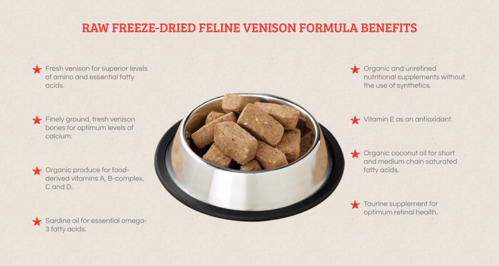 成份:鹿肉(含碎骨)、鹿肝、有機羽衣甘藍、有機南瓜、有機蘋果、有機胡蘿蔔、有機葵花籽、有機南瓜籽、有機綠花椰菜、有機藍莓、有機蔓越莓、有機歐芹、有機蘋果醋、蒙脫土、魚肝油、魚油、有機椰子油、鹽、有機葵花籽油、乾酵母、牛磺酸、維生素E補充劑、液體嗜酸乳桿菌發酵產品、液體乾酪乳桿菌發酵產品、液態羅伊氏乳桿菌發酵產品、液體動物雙歧桿菌發酵產品、有機苜蓿粉、乾有機海帶、有機迷迭香萃取物
