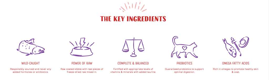 三文魚、海魚粉、扁豆、鷹嘴豆、豌豆、葵花籽油(以混合生育酚作防腐處理)、天然蔬菜香料、三文魚粉、鱈魚、葫蘆巴籽、曬乾苜蓿菜、蒲公英葉、鱈魚肝油、牛磺酸、 氯化膽鹼、以混合生育酚作防腐處理、 絲蘭提取物、百里香、迷迭香、鼠尾草、蔓越莓、蛋白鋅、蛋白鐵、蛋白銅、蛋白鎂、蛋白錳、亞硒酸鈉、維他命E補充劑、碘酸鈣、蛋白鎂、硝酸硫胺明、菸鹼酸補充劑、泛酸鈣、核黃素補充劑、維他命A補充劑、維他命D3補充劑、維他命B12補充劑、鹽酸吡哆辛、生物素、葉酸、鹽、乾乳酸片球菌發酵物、乾嗜酸乳桿菌發酵物、乾長雙歧桿菌發酵物、乾芽孢乳酸菌發酵物
