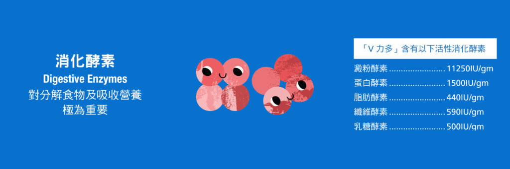 「V力多」特選益生元組合:β-葡聚醣 + 甘露寡糖可刺激配方中益生菌的生長和活躍量,確保產品更有效。