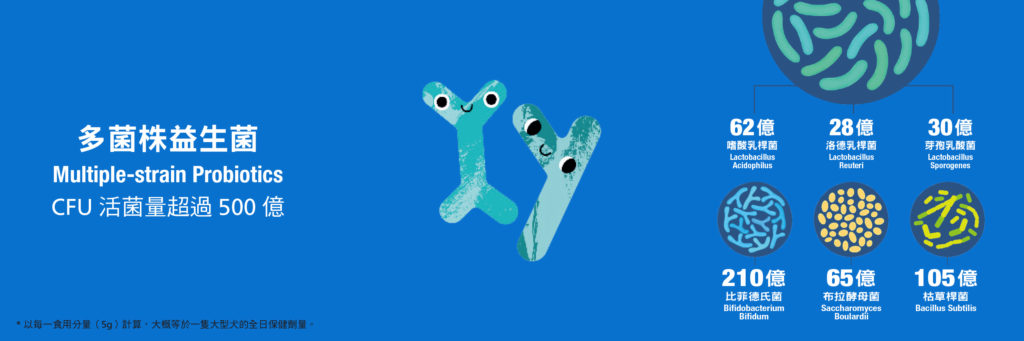 高菌量可以確保足夠細菌到達消化道內所需位置。配方特別含有能夠減輕腹瀉的益生菌布拉酵母菌(Saccharomyces Boulardii),